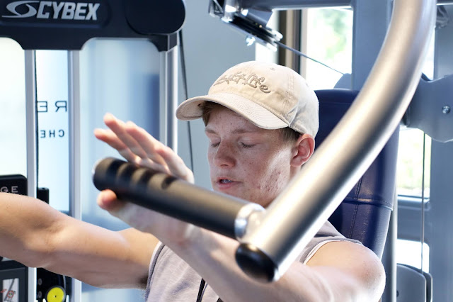 Wesley closes his eyes in concentration to use the chest machine. According to him a way to help build confidence is " Getting out more."