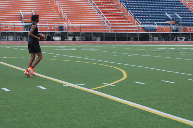 Adams follows through with his throwing arm after throwing a pass downfield. Adams says the main difference he's noticed since entering college is the business-like approach to the game that players have to possess.