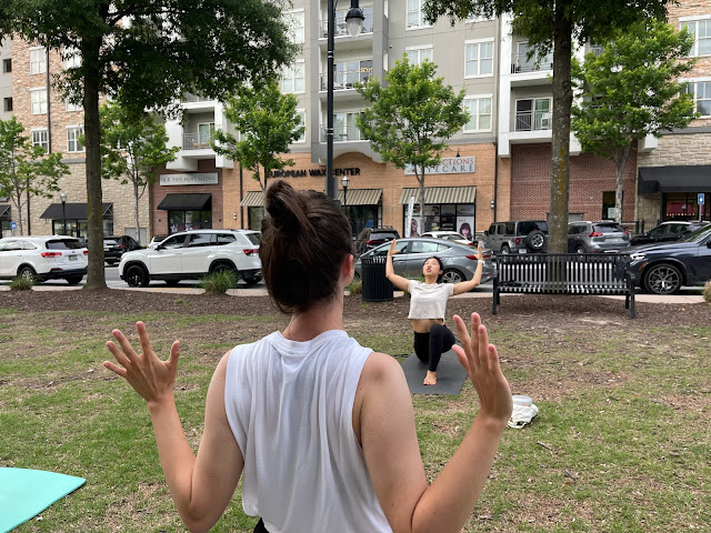 Participants transitioning between the warrior one and two poses. Similar to cactus pose, warrior 1 is a heart-opening position.Participants in tree pose. The woman on the left, Foster, has been participating in these spring yoga events at Town Brookhaven.Lee instructs her students on transitioning from chair pose to open-arm chair pose. Lee is an instructor from Element Yoga ATL, and has been teaching these free classes for all of the month of May. The participants in warrior three position. The woman in the white disclosed that she is always self-concious of her balance and how she looks in these balance heavy positions.Lee and participants in reverse warrior position. These classes in Town Brookhaven are offered to any skill level or age. Lee works up a sweat in boat position. At this section of the class, they began core-focused poses.Students in supine knees to chest pose. This is a restorative pose that also uses the core to balance as you rotate from side to side at a 45 degree angle.Student in plow pose. Lee gives the students freedom over what positions they can or cannot do with their specific bodies. Lee in supine pigeon pose. At this point in the flow, they have retreated to supine poses which means lying down facing upward.Students in supine spinal twist. These are one of the last poses for the hour long class.Student in happy baby pose. At this point the students are performing more calm, restorative poses.Students laying down at the end of class. This is called savasana, a closing restorative pose that is often paired with meditation.
